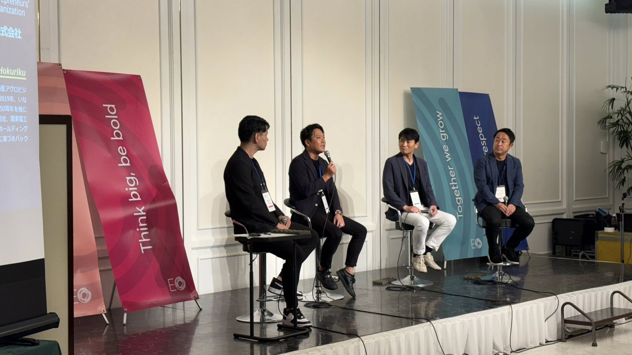 そして第二部のパネルディスカッションでは、「地域活性」「IPO」という2つのテーマで3名ずつの起業家にご登壇いただきました。我らがEO Hokurikuのまーくん(花田 将司 氏)もパネラーとして参戦!