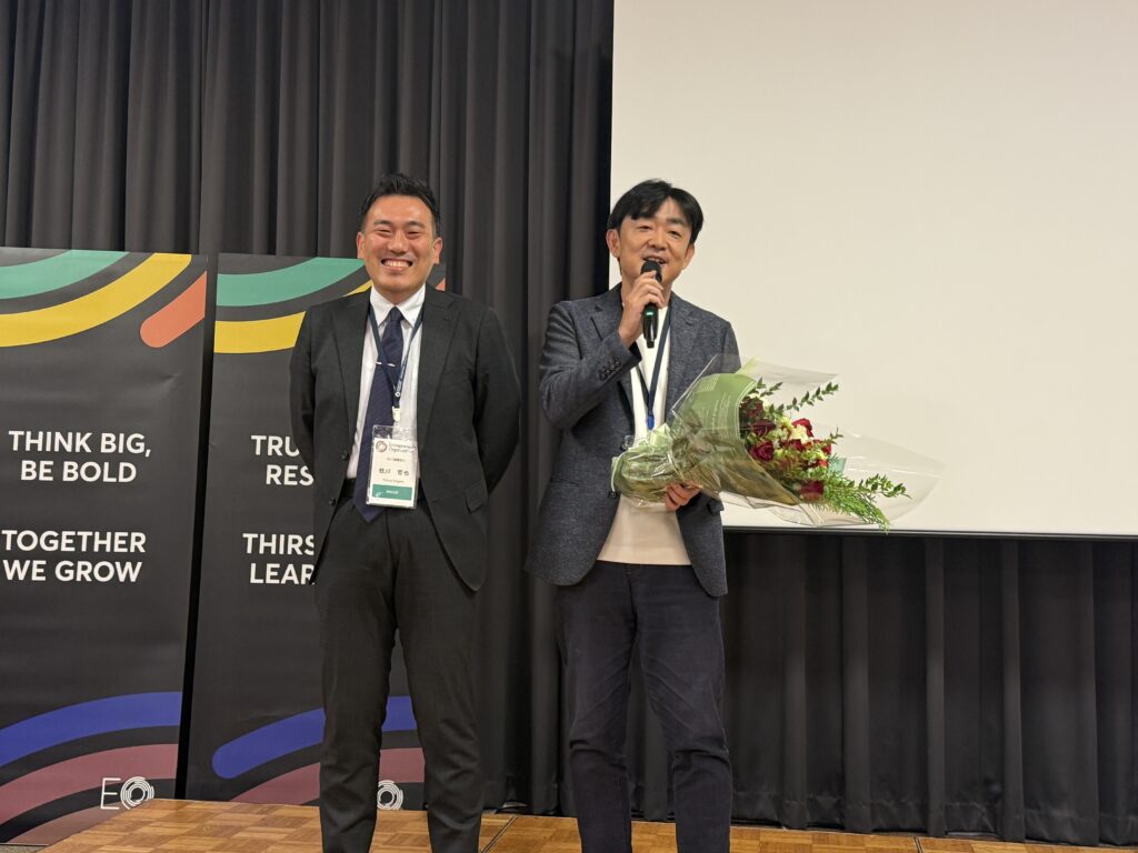 終了後の懇親会では、EO Hokurikuで圧倒的成長を果たし、このたび「TOKYO PRO Market」に上場されたメンバーのETさん(榎 崇斗さん、taneCREATIVE株式会社 代表取締役)にサプライズプレゼント!